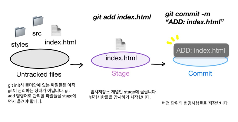 기본적으로 git 명령어 옵션으로 작성된다. 예를 들어 git add abc.html 같은 경우 abc.html을 스테이지에 올리겠다는 뜻입니다.