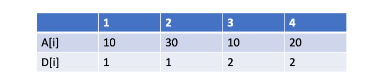 두번째로 A[4]를 진행한다. A[4] 값은 A[2]보다는 작지만 A[3]보다는 크기 때문에 D[4]값은 2를 갖는다.