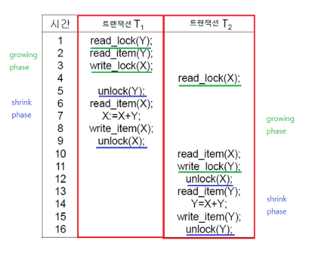 - growing phase는 read_lock, write_lock을 의미하고, shrinking phase는 unlock을 의미합니다.