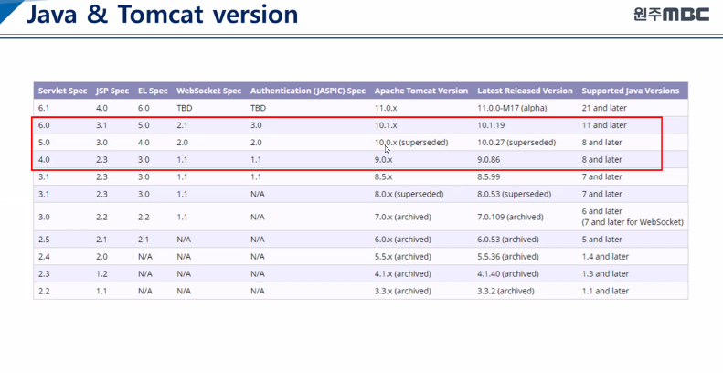 -java version이 뭐냐에 따라서 tomcat 버젼이 결정됩니다.