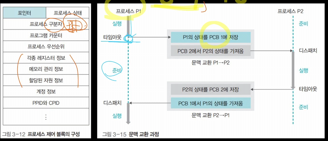 프로세스 1을 수행하다가 프로세스 2로 이동한다. 이를 Context Swithching이라고 합니다. 이동할 때 프로세스 컨트롤 블록에 프로세스 상태를 저장합니다. 문맥을 이어가기 위한 생태를 저장합니다. 연산할 때 상태가 변하는데 그 상태의 변화는 레지스터에 저장됩니다.