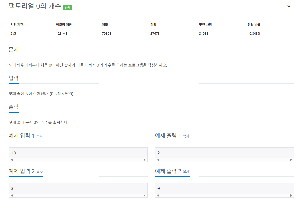 팩토리얼 소인수분해하여 5의 갯수를 통해 출력값을 알 수 있다. 5의 n 제곱 수 같은 경우에는 카운트수를 하나 더 해줘야 한다. 단순히 5로 나누는 것이 아니라 반복문을 통해 5로 나누면서 누적합을 해줘야 한다.