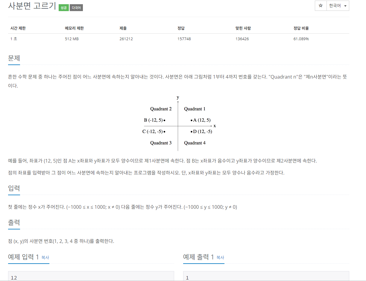x와 y가 모두 양수이면 1사분면이므로 1을 출력한다.