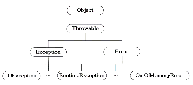 자바에서는 실행 시 발생할 수 있는 오류(Exception, Error)를 클래스로 정의하였다.