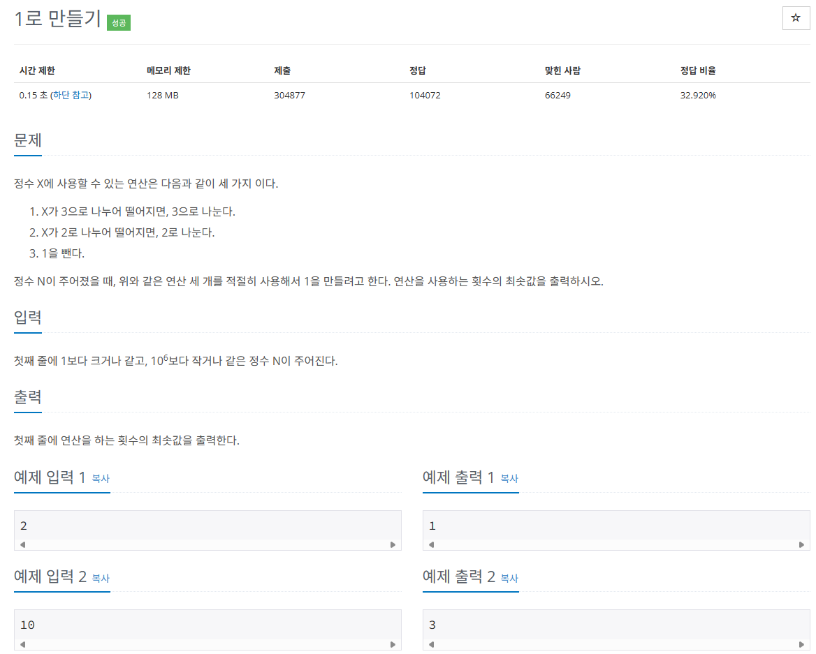 N을 각각 2와 3으로 나누면, count에는 +1에 각 연산의 나머지값을 더한 값이 들어간다. 나머지값은 빼기 1 했을때 count와 같기 때문이다. 재귀 호출을 이용하므로 다이내믹 프로그래밍 Top-down 방식이다.